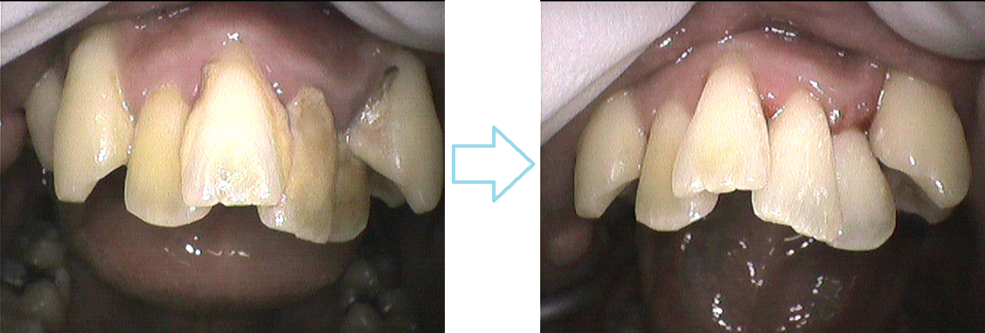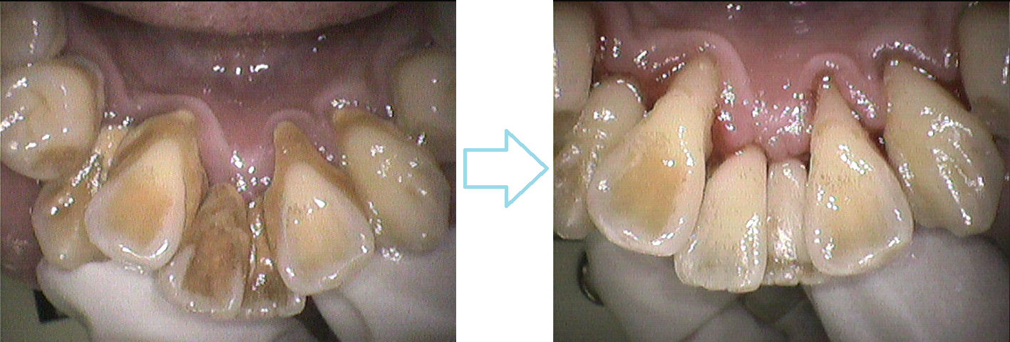 下の前歯の表側と裏側のクリーニング前後のお写真です📸